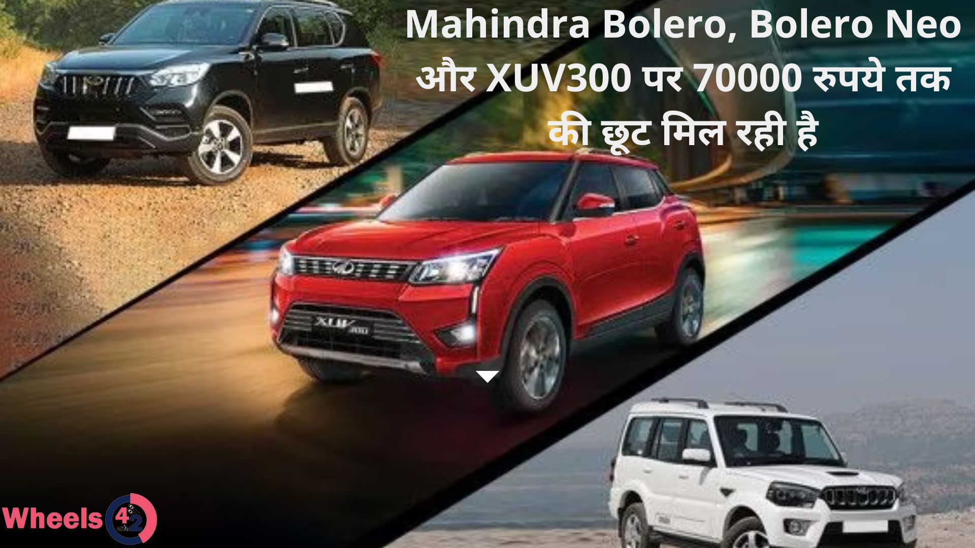 Mahindra के चाहने वालों के लिए बड़ी खबर| Mahindra फरवरी 2023 के लिए Bolero, Bolero Neo, Marazzo और XUV300 पर 70,000 रुपये तक की छूट और लाभ दे रही है। हालांकि, इस फरवरी में Mahindra की लोकप्रिय SUVs जैसे Scorpio Classic, Scorpio N, Thar और XUV700 पर कोई छूट नहीं है। हाल ही में लॉन्च हुई XUV400 EV पर भी कोई छूट नहीं है। Mahindra Bolero, Bolero Neo और XUV300 पर 70000 रुपये तक की छूट- पूरी जानकारी यहां से पढ़ें।