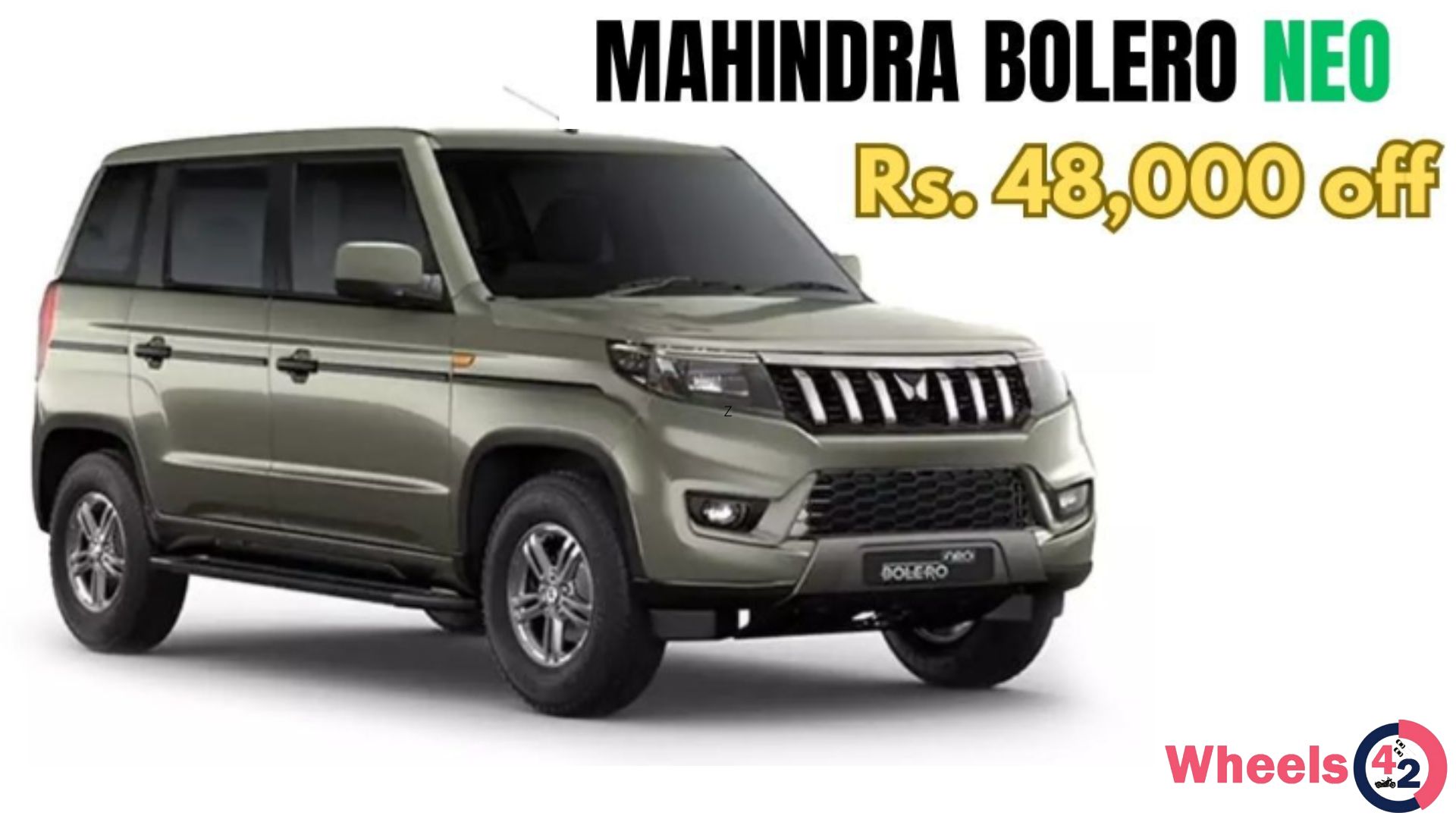 Mahindra India अप्रैल 2023 के लिए अपनी SUV, Bolero Neo पर भारी छूट दे रहा है। लाभ cash discounts, accessories packages और अतिरिक्त exchange bonuses के रूप में हैं। Bolero Neo को चार वेरिएंट में एक powertrain के साथ पेश किया गया है। Mahindra Bolero Neo SUV को हाल ही में BS6 update प्राप्त हुआ है और छूट 30 अप्रैल 2023 तक वैध है। Mahindra Bolero Neo पर 48000 रुपये तक की छूट मिलती है- पूरी जानकारी यहाँ से पढ़ें।